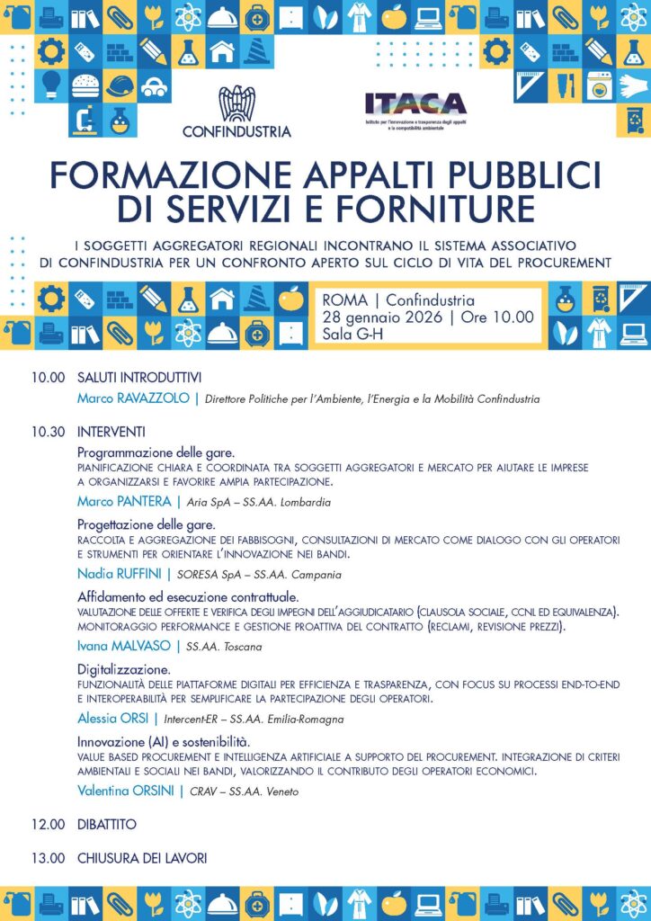 ANIP-Confindustria-Präsident Angelo Volpe nahm an einer Confindustria-Veranstaltung teil, die den vollständigen Lebenszyklus der öffentlichen Vergabe untersuchte — mit Fokus auf die Rolle regionaler Aggregatoren bei Dienstleistungs- und Lieferausschreibungen.